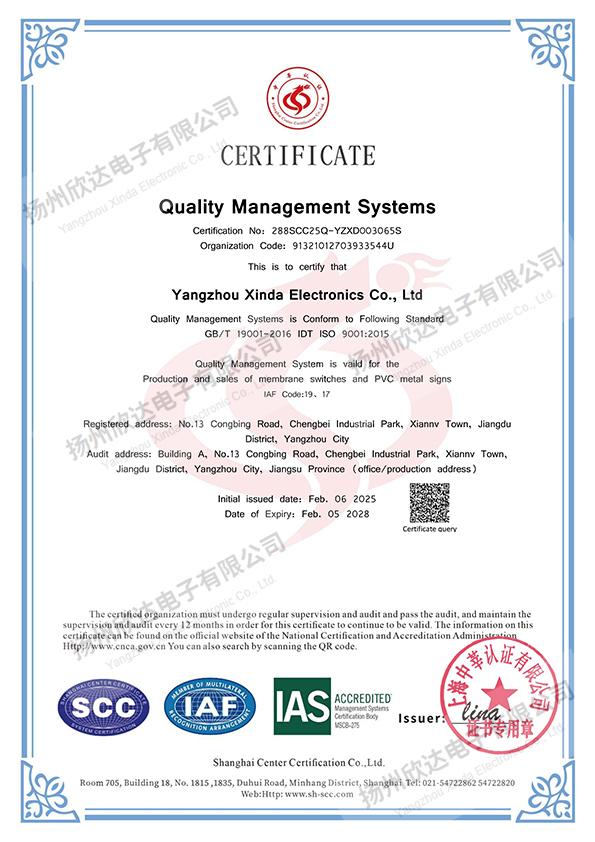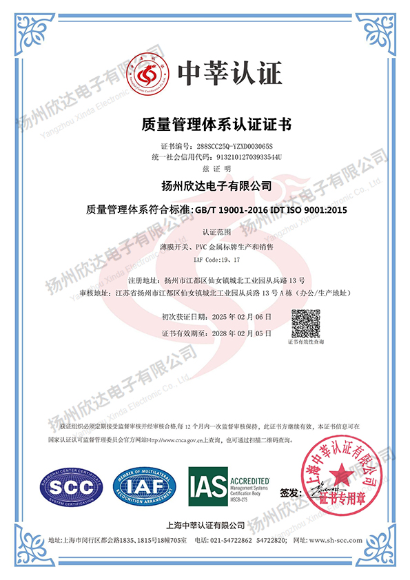 揚(yáng)州欣達(dá)電子有限公司是一家從事電子輕觸薄膜開關(guān),薄膜面板及PVC、金屬標(biāo)牌,不干膠貼,噴塑、烤漆絲印面板等各種絲印工藝的有限責(zé)任公司。公司位于風(fēng)景秀麗的文化名城江蘇揚(yáng)州市江都區(qū)。自1993年建廠以來,我們致力于信譽(yù)至上,顧客為首的原則,及時(shí)為廣大客戶提供合格滿意的產(chǎn)品:堅(jiān)持著質(zhì)量為首,持續(xù)改進(jìn)的方針,狠抓品質(zhì)管理,取得了客戶的認(rèn)可:履行著誠信、互惠的宗旨,贏得了客戶的支持和信任。目前公司擁有先進(jìn)的絲網(wǎng)印刷設(shè)備,熟練的業(yè)務(wù)技術(shù)骨干和嶄新適用的廠房,每年為全國各地的客戶提供數(shù)億的合格產(chǎn)品。我們把“誠信、務(wù)實(shí)、求精、創(chuàng)新”作為我們的企業(yè)宗旨,在經(jīng)營管理中貫徹“以人為本,精益求精”的經(jīng)營理念;在生產(chǎn)管理中嚴(yán)格按ISO9001質(zhì)量體系落實(shí)生產(chǎn); 在為客戶服務(wù)過程中按照產(chǎn)品的分類提供多種設(shè)計(jì)方案,讓我們產(chǎn)品更好體現(xiàn)客戶的理念。...
